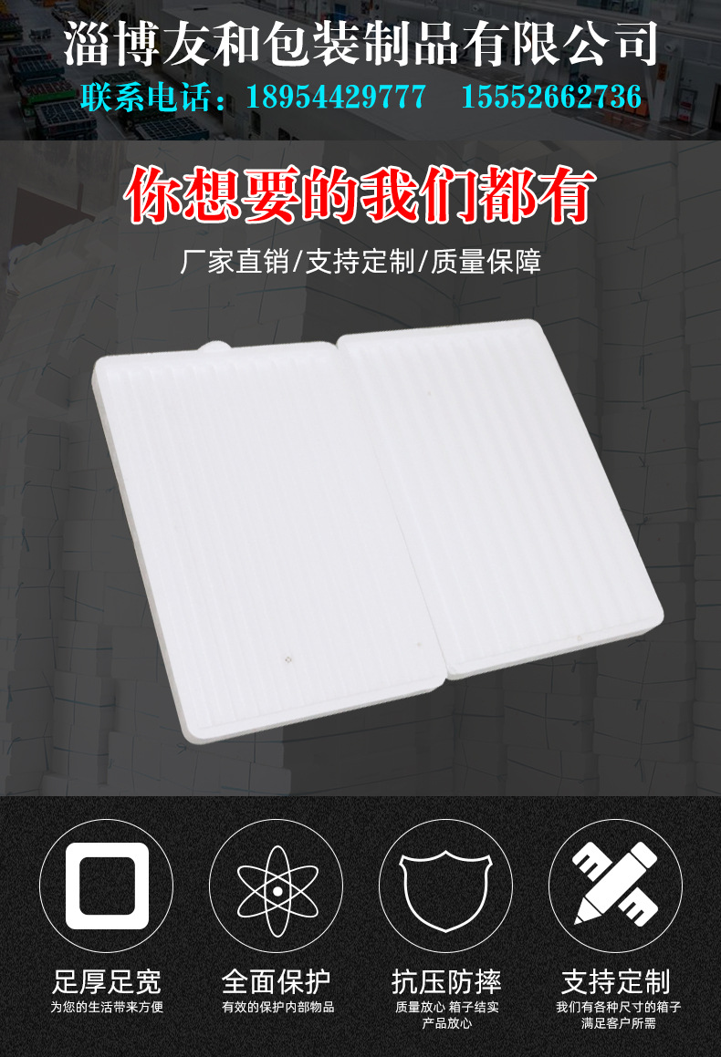 介紹參數(shù)圖冊 ????淄博友和包裝制品有限公司是專業(yè)的山東泡沫包裝箱加工廠家,本廠主要產(chǎn)品有:泡沫包裝箱,泡沫保鮮箱,水果蔬菜泡沫包裝箱,水果蔬菜泡沫保鮮箱,瓷磚泡沫包裝箱等,產(chǎn)品暢銷全國,深受用戶好評。泡沫包裝定做可以聯(lián)系我們網(wǎng)站 http://m.nxzxx.com/ 上電話,我們會第一時間跟您聯(lián)系。 上一篇棉花糖機(jī)防壓泡沫包裝盒 下一篇普通電瓶包裝泡沫箱